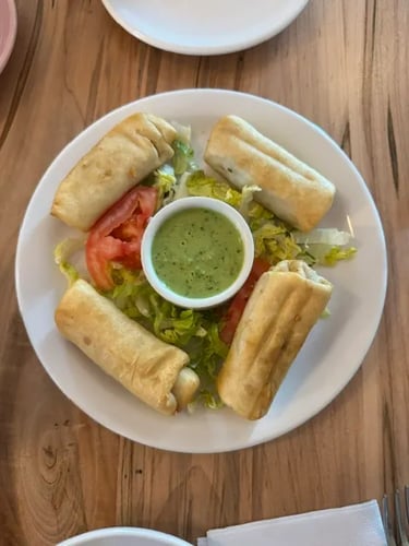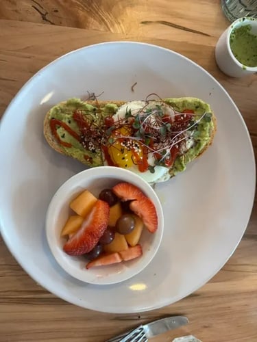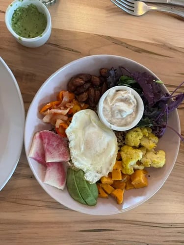 We ordered steak taquitos for an appetizer; I ordered the avocado toast (like a TRUE millennial), and Brennan ordered the grain bowl. The steak taquitos were delicious–not as crispy as I had anticipated, but full of good flavor. The green sauce they served with it was fire (as Gen Z likes to say). Our waitress very kindly left the remaining green sauce so we could use it on our meals if we wanted to.